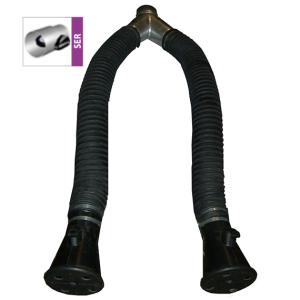 Stationärt avgasutsug med avgasfläkt för två arbetsplatser eller fordon med dubbla avgasrör.