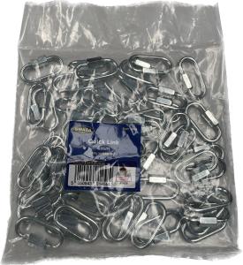 Förpackning med snabblänkar - skruvkopplingar för kedjor. 6mm. Invändig längd: 47mm. Invändig bredd: 14mm. 4 st. Förzinkad