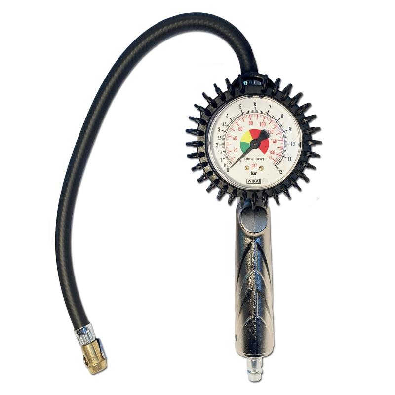Stor manometer med kraftigt gummerat skyddshölje. Med luftanordning och klämnippel för fastsättning av ventil och manometer.