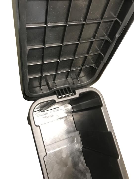 Robust verktygslåda i plast för trailer, släpvagn, husvagn etc. Storlek: 565mm L x 245mm B x 290mm H. Låsbar. 2 nycklar medföljer. Max last: 100 kg