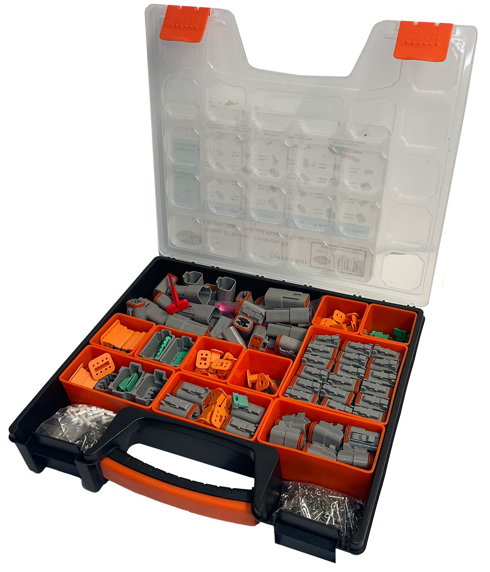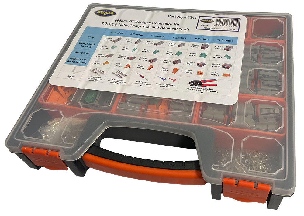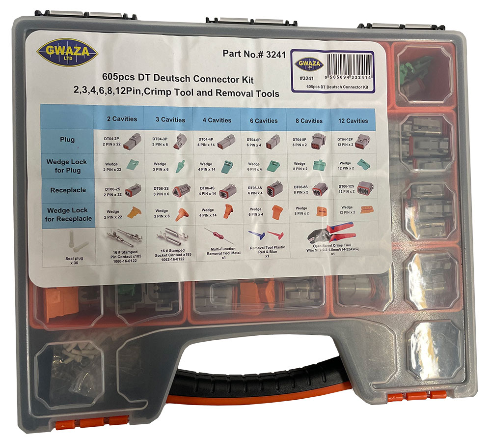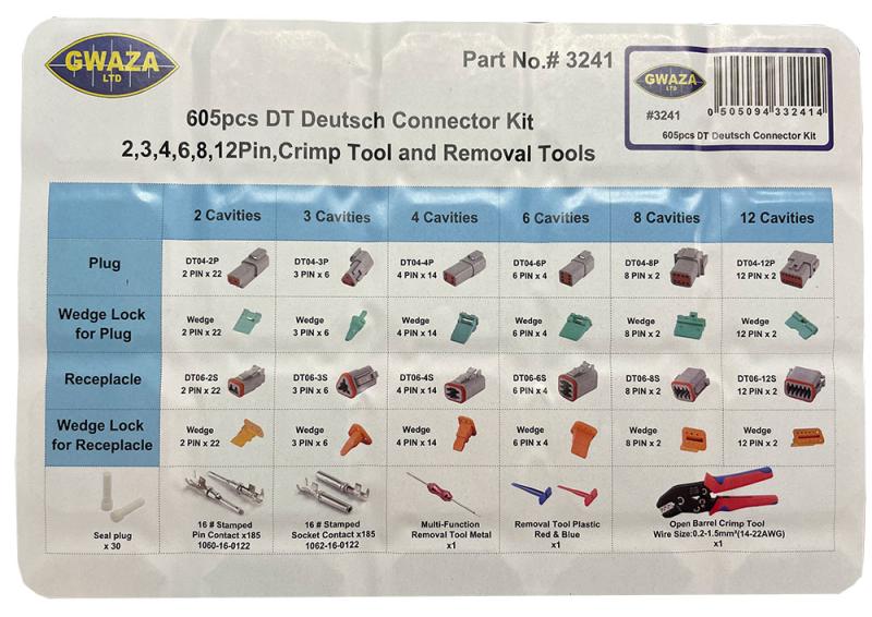 DT Deutsch kontaktsats 2-, 3-, 4-, 6-, 8- & 12-polig. Krymptång och borttagningsverktyg. Totalt 605 delar