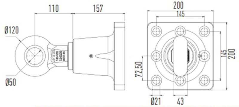 Bogserögla med fläns 50 mm. Kapacitet: 152 kN. Max belastningen: 3000 kg. Åtdragningsmoment (Nm): 650-670. Typgodkänd E13. Se bild 3 för mått!