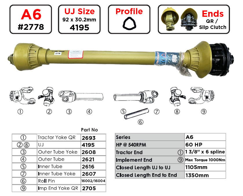 Kraftöverföringsaxel / PTO-axel 6-splines A6 - 60Hk Snabbkoppking/Lamellkoppling